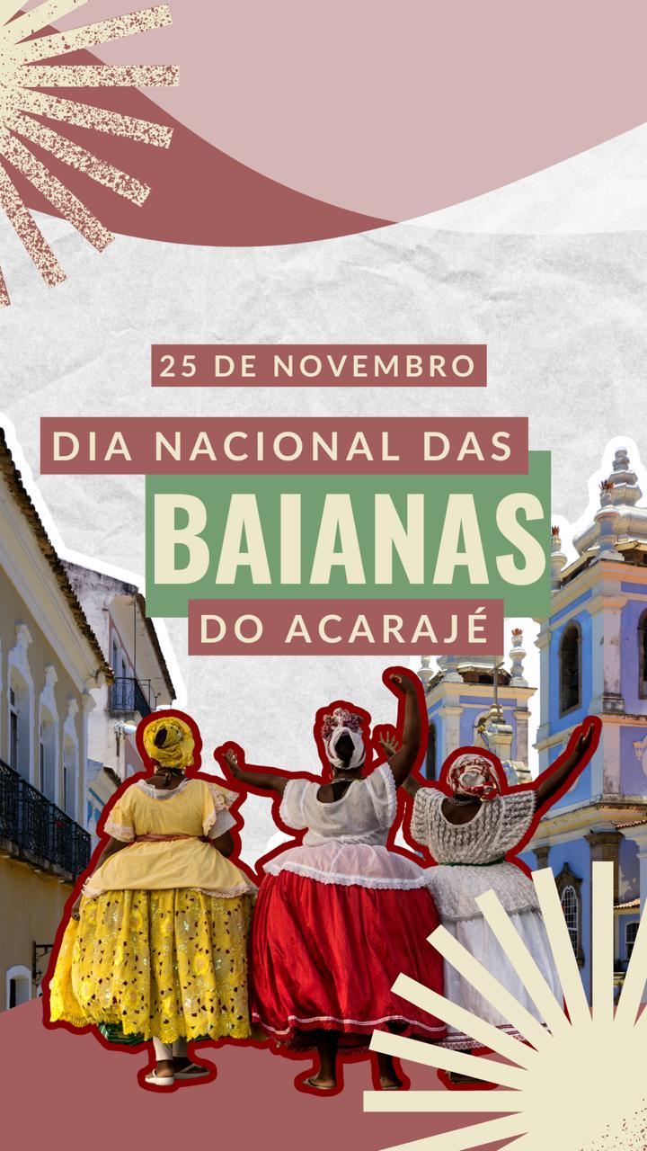 Reconhecidas internacionalmente como as primeiras empreendedoras do Brasil, as Baianas do Acarajé comemoram no dia 25 de novembro seus mais de 300 anos de atuação no segmento cultural, patrimonial, artístico e identitário. A celebração desta importante data é um momento de homenagens as Baianas de hoje e as que vieram antes e lutaram bravamente pela manutenção das suas tradições, memórias e histórias, tornando-se o símbolo mais conhecido da nossa terra em todo o mundo.