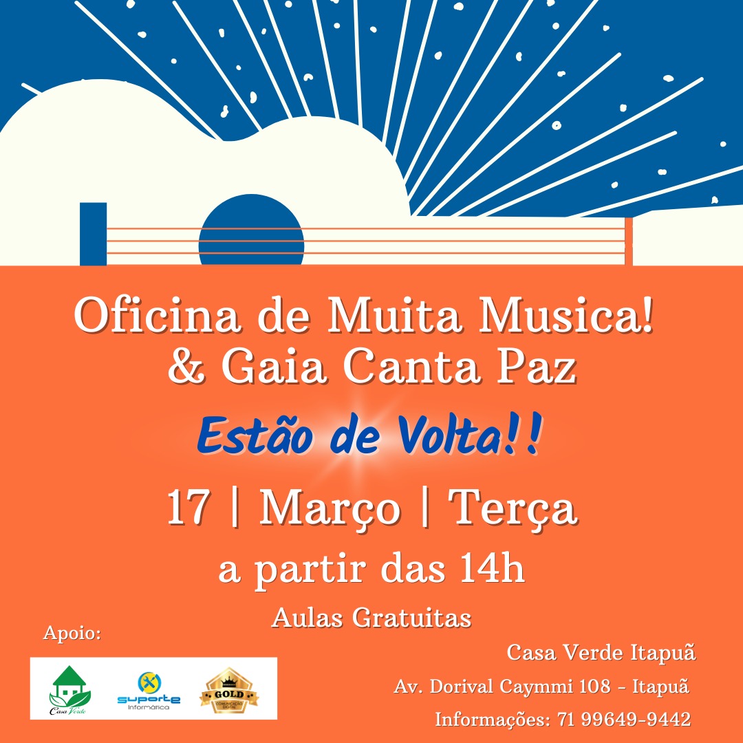 Estão de volta as aulas gratuitas de violão da Oficina de Muita Música!, seguidas pelas sessões do Gaia Canta Paz, projeto que propõe emanar vibrações curativas de paz, amor e alegria através do poder da música. As atividades retornam a partir da próxima terça-feira, 17 de março, na Casa Verde Itapuã (Av. Dorival Caymmi, 108 – Itapuã).