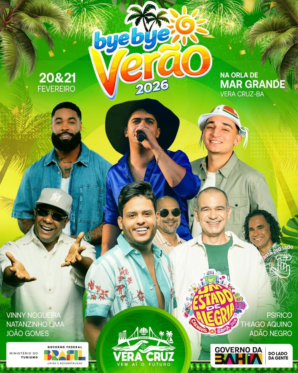 O município de Vera Cruz será palco de um dos maiores eventos musicais do calendário de verão com a realização do Bye Bye Verão, nos dias 20 e 21 de fevereiro, reunindo grandes atrações nacionais e promovendo um forte impacto cultural, turístico e econômico na cidade. Com uma programação diversificada e de grande apelo popular, o evento foi planejado para atrair moradores e visitantes, oferecendo dois dias de entretenimento, valorização cultural e estímulo à economia local. A grade artística reúne nomes de destaque da música brasileira em diferentes estilos, garantindo pluralidade de público e grande expectativa de participação. Estão confirmados João Gomes, Natanzinho Lima, Adão Negro, Psirico, Thiago Aquino e Vinny Nogueira.