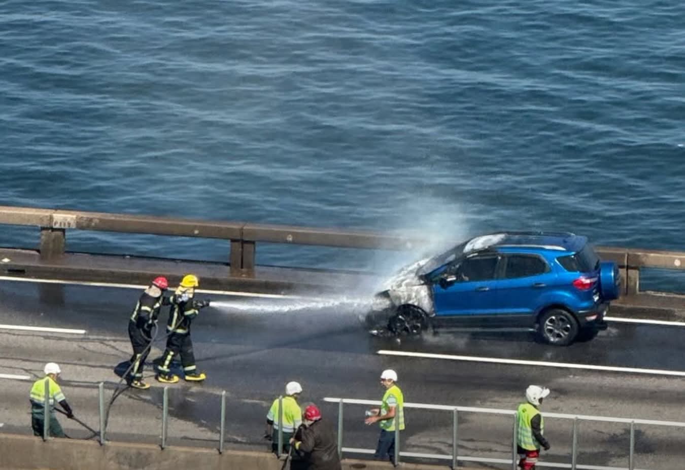 CARRO PEGA FOGO E INTERDITA TRÂNSITO NA PONTE RIO-NITERÓI