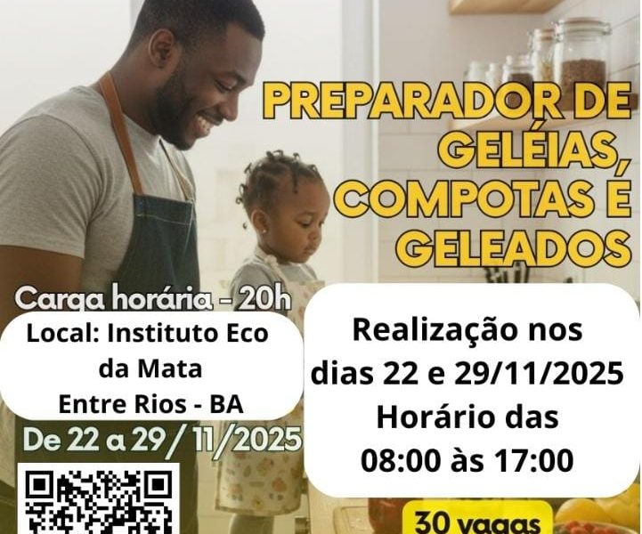 PREPARADOR DE GELÉIAS, COMPOTAS E GELEADOS 📆 Sábados, 22/11 e 29/11/2025.⏰ 08h às 17h📍Instituto Eco da Mata💸 Atividade gratuita📝Certificado pelo IFBaiano. Awery