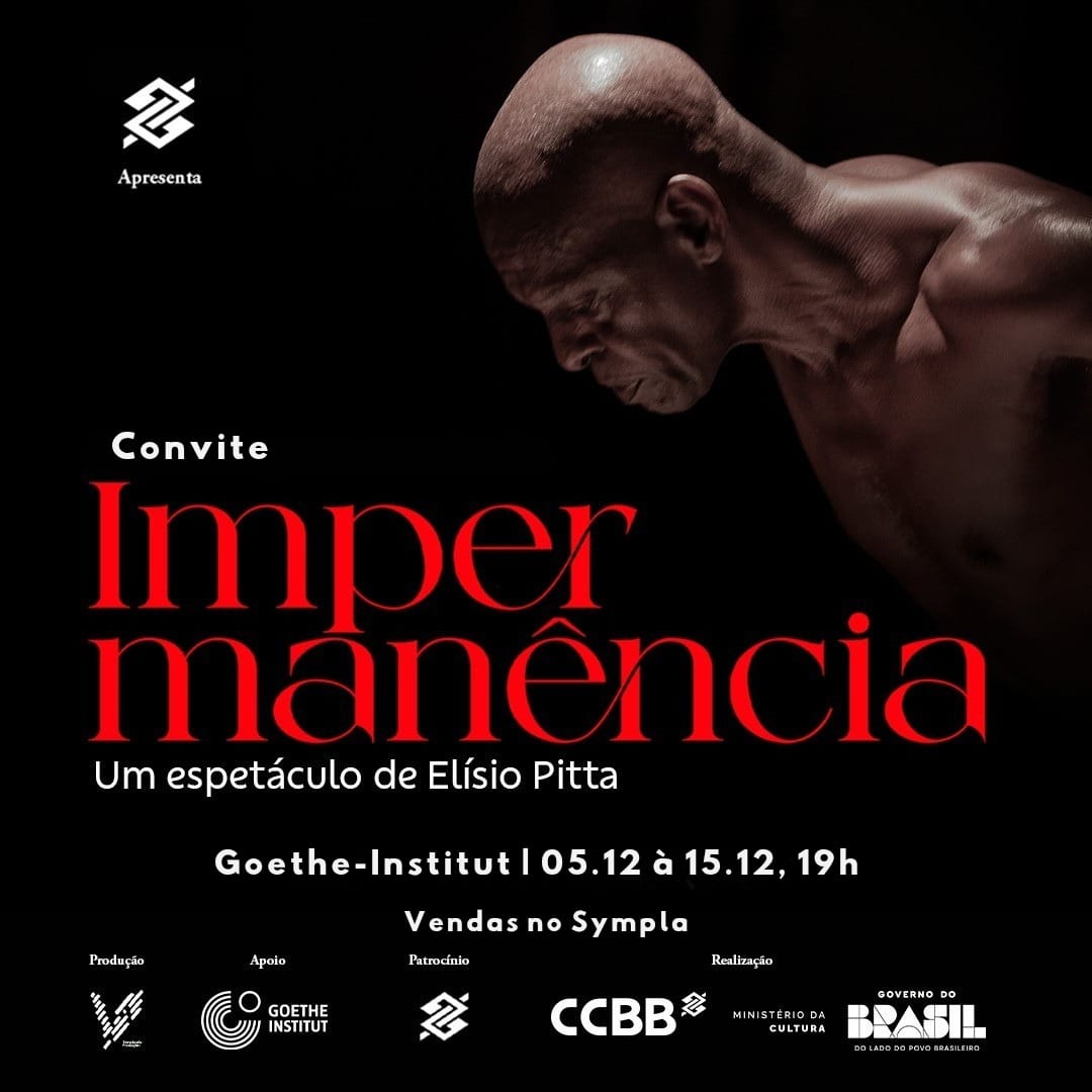 De 28 de novembro a 15 de dezembro, de quinta a segunda-feira, às 19h, o público de Salvador poderá vivenciar IMPERMANÊNCIA, espetáculo de Elísio Pitta, com direção artística e encenação de Gatto Larsen e supervisão coreográfica de Clyde Morgan, no Teatro do Goethe-Institut, no Corredor da Vitória.