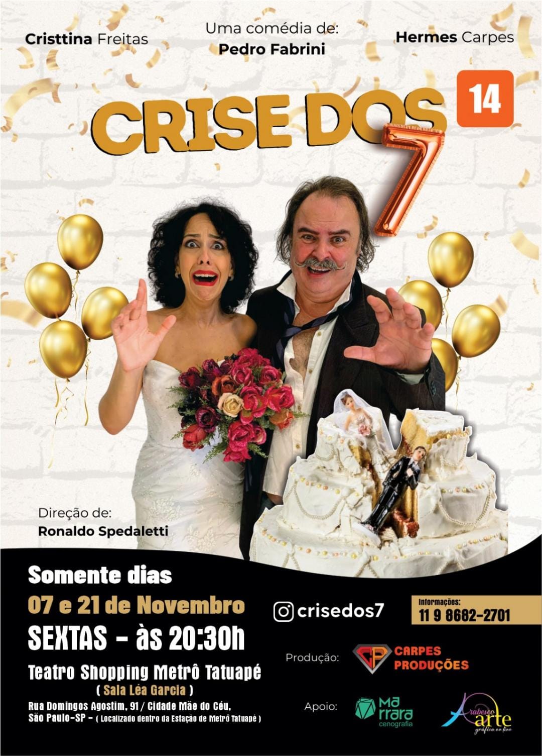 Nessa comédia imperdível, os atores Hermes Carpes e Cristtina Freitas trazem para o palco as desventuras de um casal passando pela crise dos 7 anos de casamento. Com inteligência, romantismo e muito humor, a “Crise dos 7” é não só uma grande comédia, mas uma sequência de momentos hilários que criam identificação desde o primeiro minuto com o espectador.