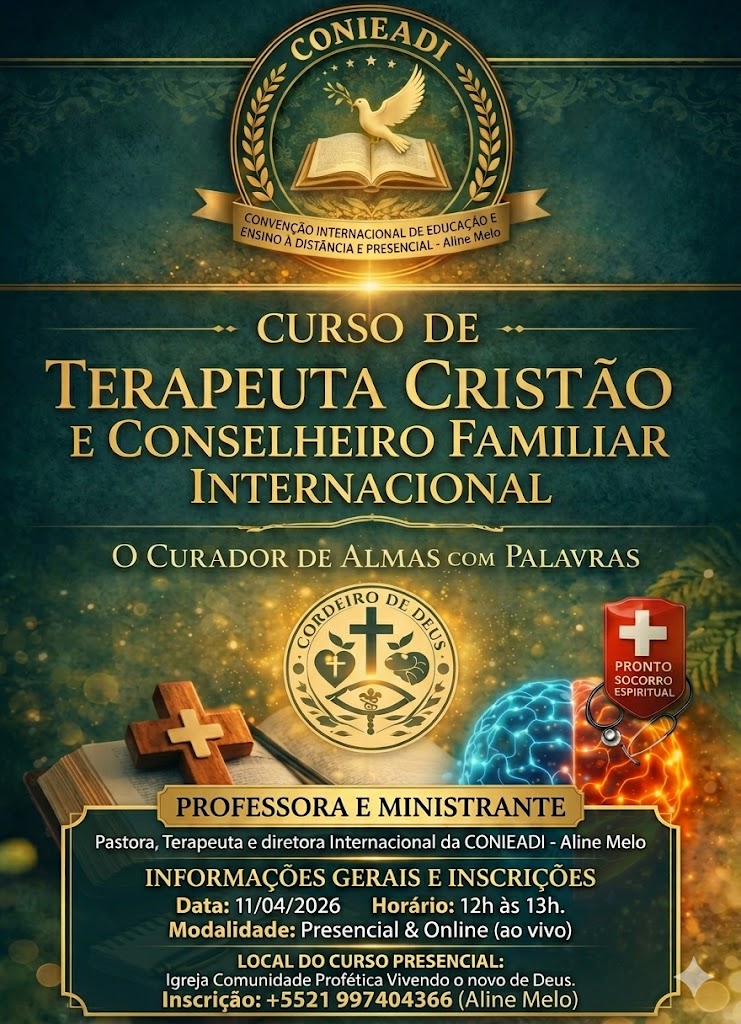 No dia 11 de abril de 2026, às 12h acontecerá o “Curso de Terapeuta Cristão e Conselheiro Familiar Internacional” com a Pastora, Terapeuta e diretora Internacional da CONIEADI – Aline Melo.