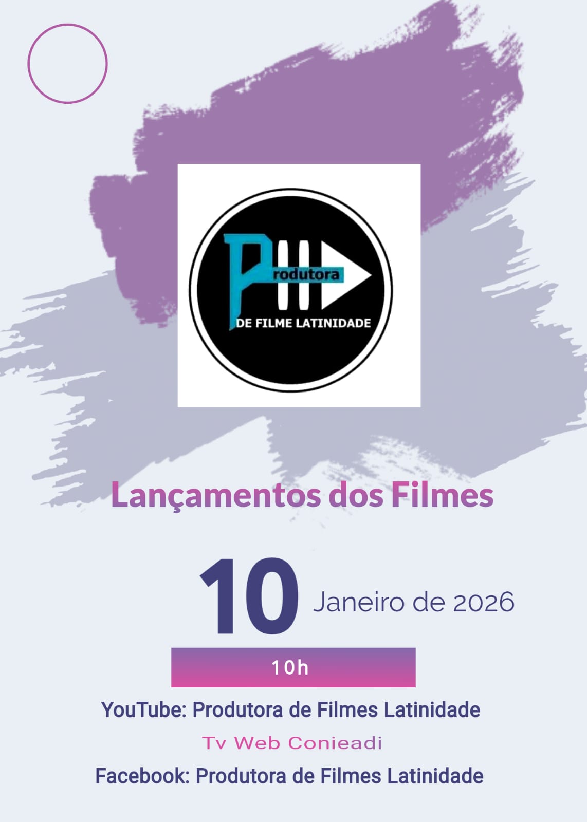 No dia 10 de janeiro de 2026 vai estreiar alguns filmes produzidos pela Produtora de Filmes Latinidade, com direção e Roteiro de Aline Melo, com transmissão da Tv Web Conieadi durante Programa Latinidade Internacional, às 10h, também estará disponível na página do Facebook: Produtora de Filmes. Acesse e veja.