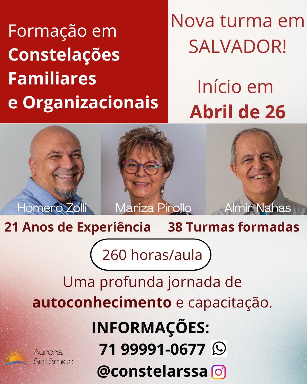 Informamos que a próxima turma do curso de Formação em Constelação Sistêmica Familiar e Organizacional do Instituto Aurora Sistêmica, em Salvador/BA já está com as inscrições abertas! 👏🏻