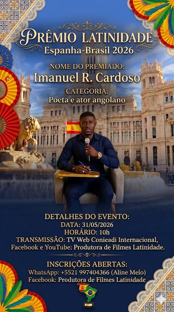 O poeta e ator angolano Imanuel R. Cardoso participará do Prêmio Latinidade Espanha-Brasil, nas categorias ator e poeta. O evento tem direção no Brasil, de Aline Melo e na Espanha, de Margarita Espino, com transmissão da Tv Web Conieadi Internacional e Facebook Produtora de Filmes Latinidade.