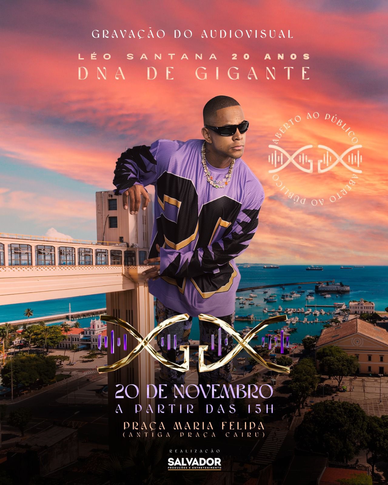 O GG Léo Santana celebra, em 2025, duas décadas de uma trajetória marcada por superação, conquistas e muitos hits. Para comemorar em grande estilo os 20 anos de carreira, o gigante da Bahia vai gravar um audiovisual GG intitulado “Léo Santana – DNA de Gigante” e mostra um pouco de como será a megaestrutura do evento através de um mapa 3D.