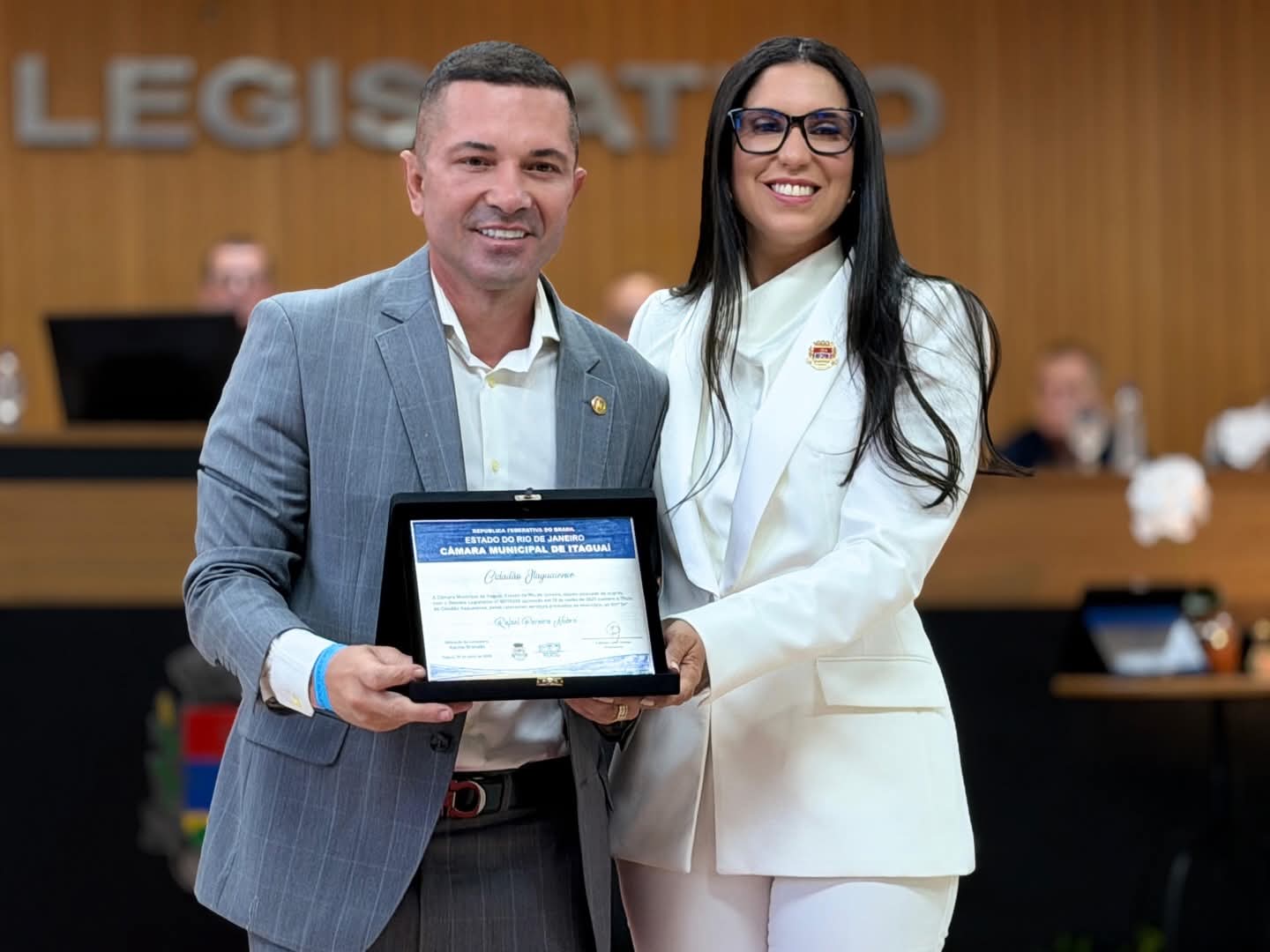 O deputado estadual Rafael Nobre foi homenageado com o Título de Cidadão Itaguaiense e a Medalha Benemérito durante uma Sessão Solene na Câmara Municipal de Itaguaí. A cerimônia contou com a presença de autoridades e amigos, incluindo o deputado federal Juninho do Pneu, que também foi homenageado.