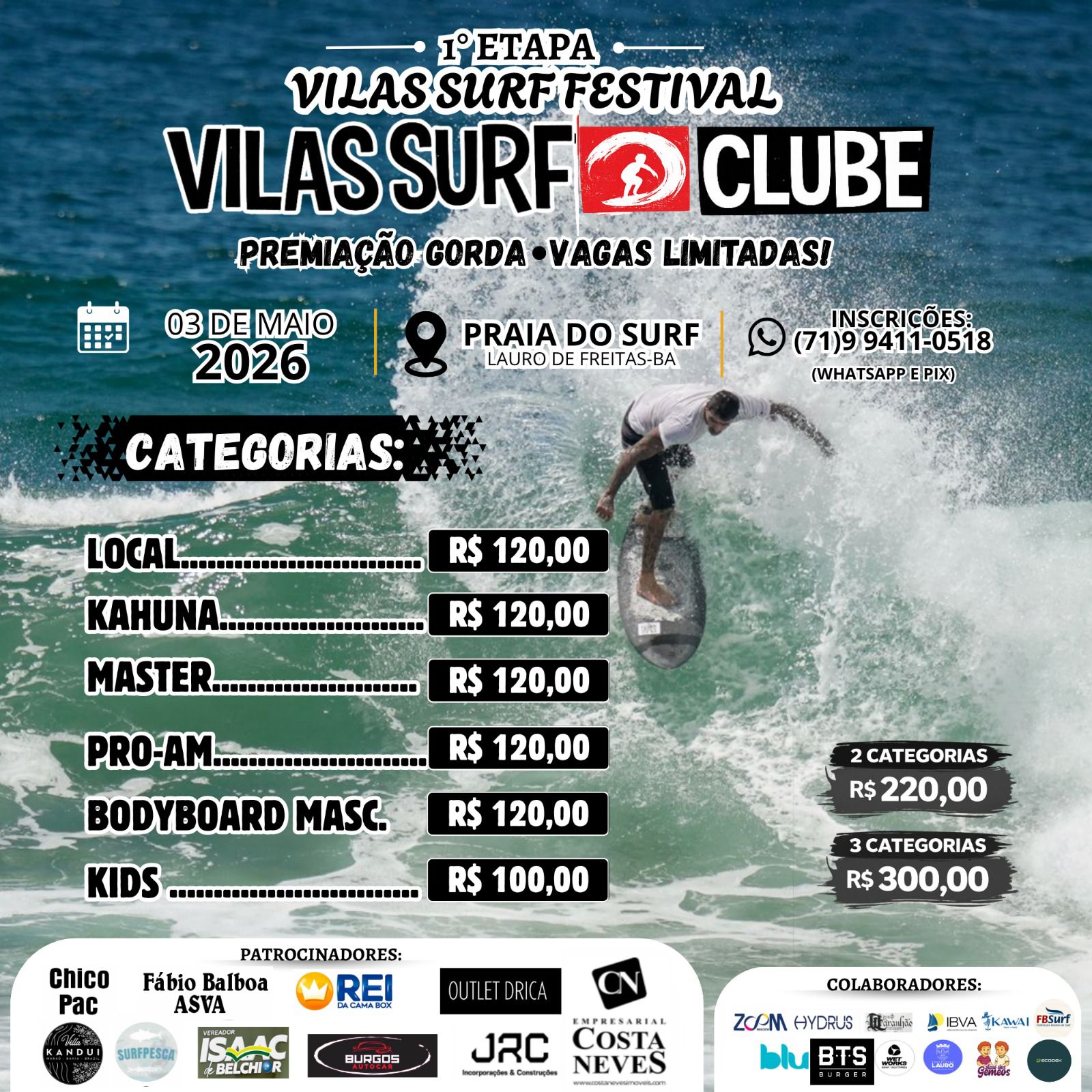 Atletas, patrocinadores e colaboradores já podem se preparar: vem aí a tão aguardada 1ª Etapa do Vilas Surf Clube, o VILAS SURF FESTIVAL 2026, que será realizado no dia 03 de maio, reunindo esporte, integração e valorização da cultura do surf.